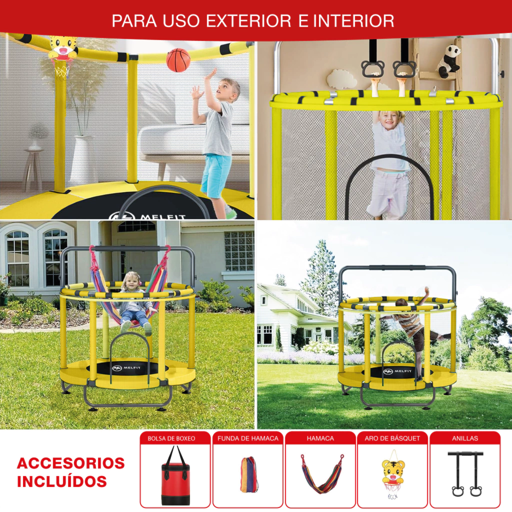 Incluye Anillos, aro de basquet y hamaca colgante para mayor diversión!
